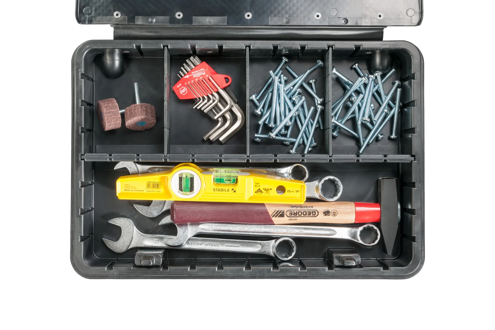 Mit unseren individuell gestaltbaren Bodenschalen, wahlweise in einer Höhe von 58 oder 88 mm erhältlich, haben Sie die Möglichkeit, Ihre Aufbewahrungslösung präzise an Ihre Projektanforderungen anzupassen. Ob Sie kleinste Teile oder sperrige Werkzeuge sicher unterbringen möchten, die flexiblen Längs- und Querstege erlauben eine optimale Raumnutzung. Ob streng unterteilt oder offen gestaltet, unsere Bodenschale passt sich flexibel Ihren Bedürfnissen an. So finden alle Utensilien ihren optimalen Platz und tragen zu einem effizienten Arbeitsablauf bei.