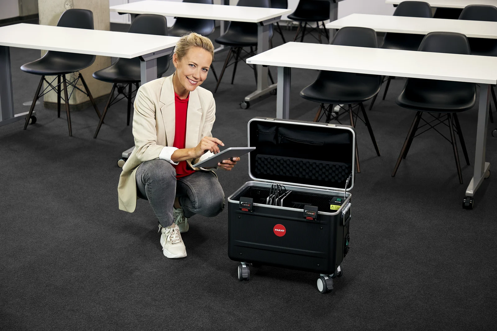Neue Maßstäbe im Bildungsbereich. PARAT verwandelt sich - so wie Technik und Organisationen liefert PARAT ab 2012 erste Serienkoffer für bis zu 16 iPads oder Tablets und setzt damit neue Maßstäbe im Bildungsbereich. Robuste Außenschalen, hochwertige Verriegelungsmechanismen sichern wertvolles IT Equipment und schützen es vor unbefungtem Zugriff. Tablets werden so sicher geladen, transportiert und gemanaged.